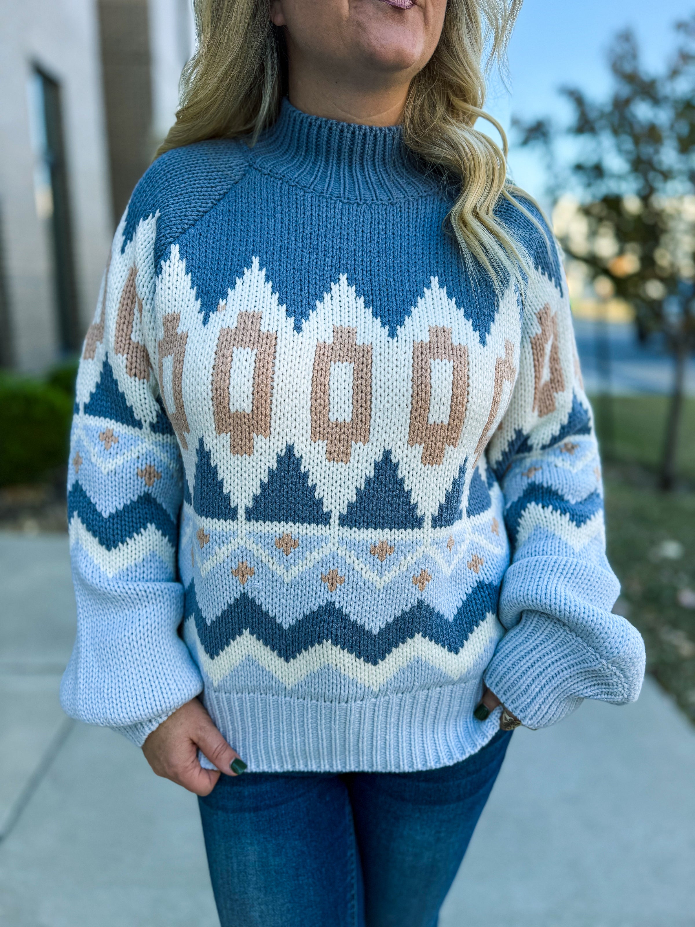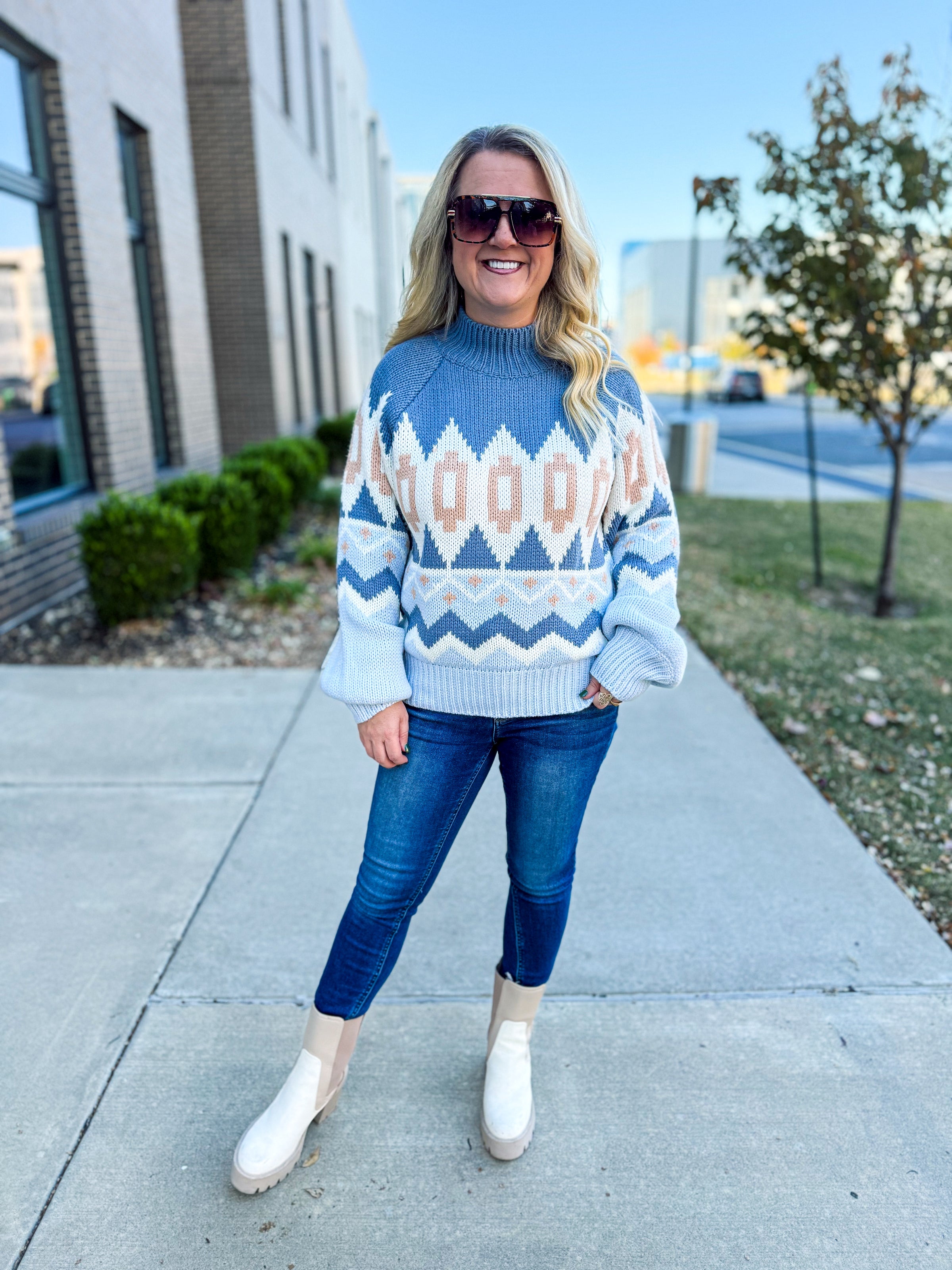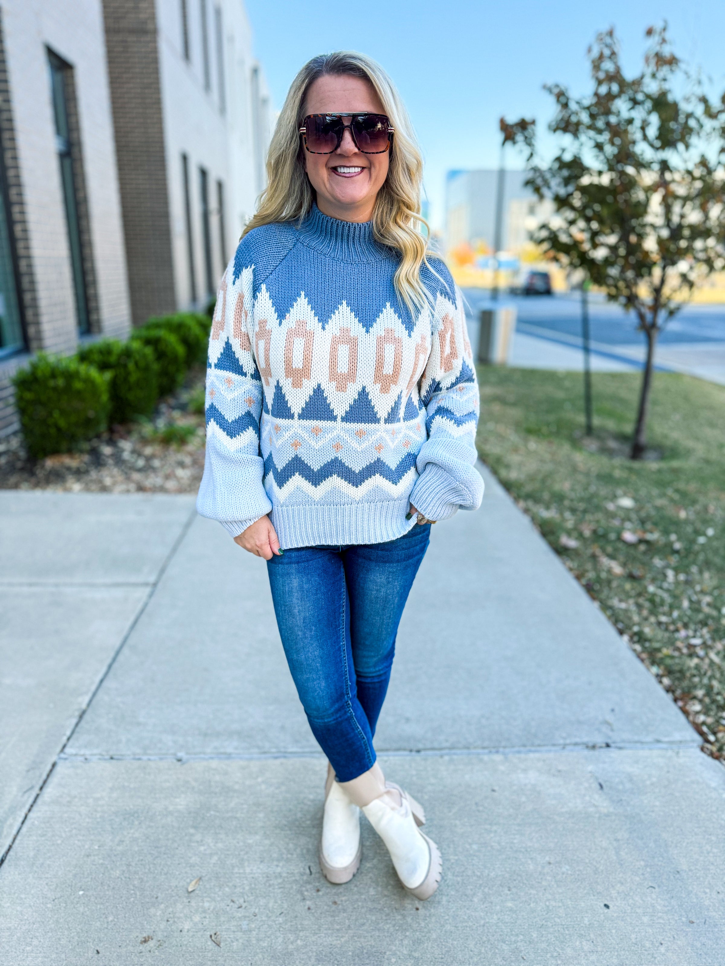 Stay warm and stylish all season long in this gorgeous Blue Chunky Knit Sweater, designed with a classic Fair Isle-inspired pattern in soft, wintery tones. Featuring shades of denim blue, cream, and warm beige, this sweater brings cozy alpine charm to your everyday wardrobe.