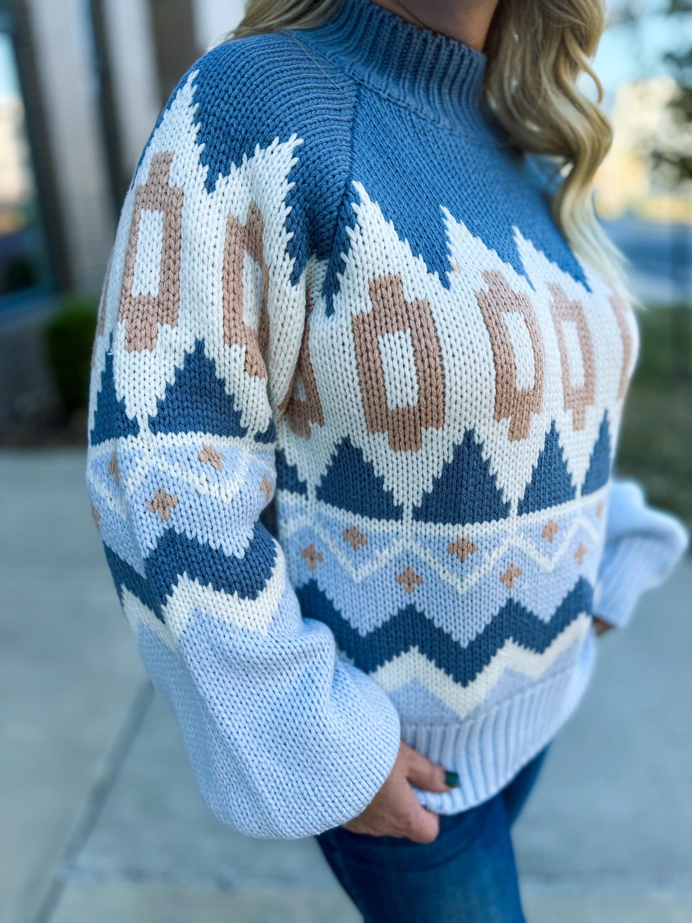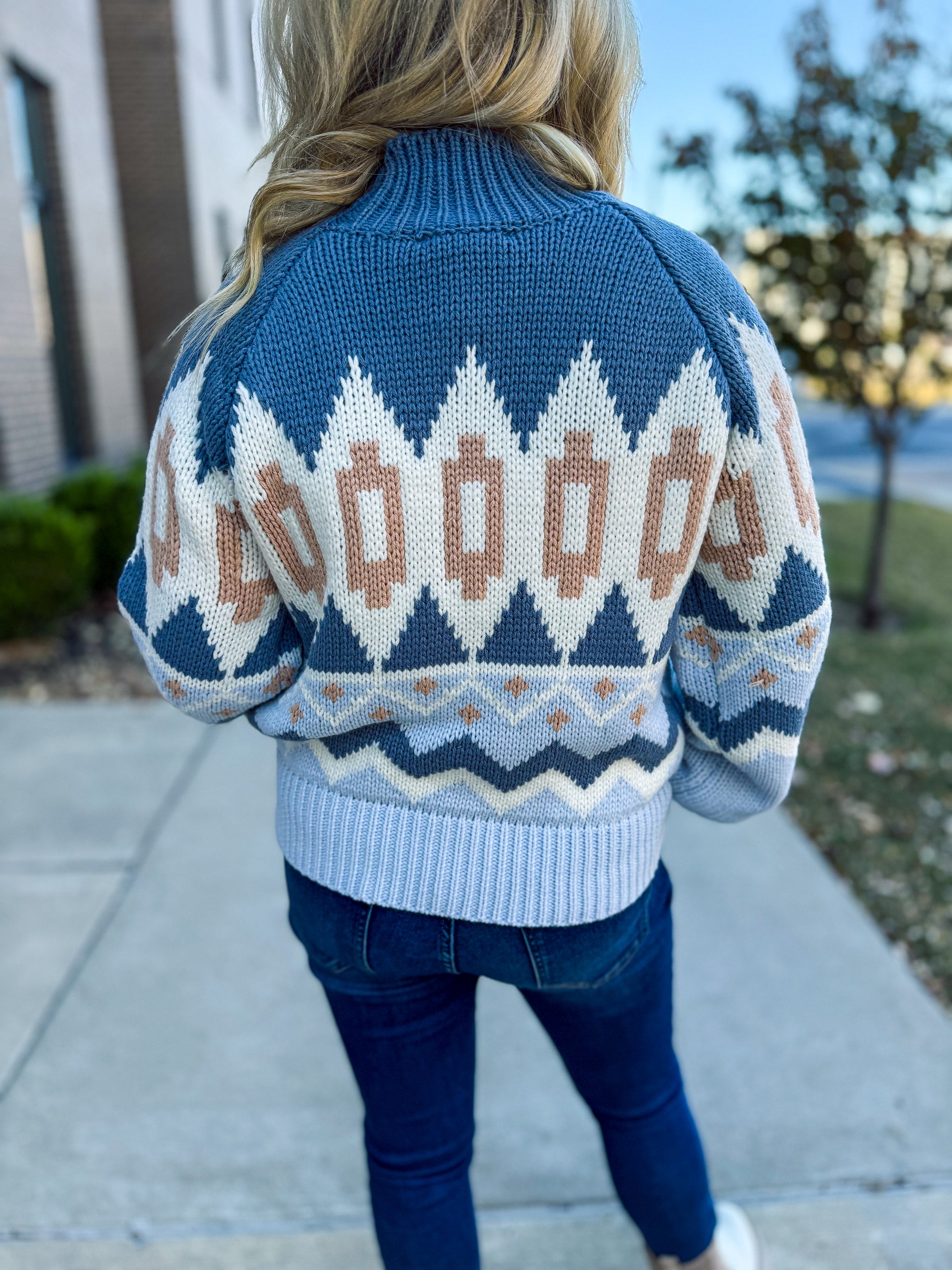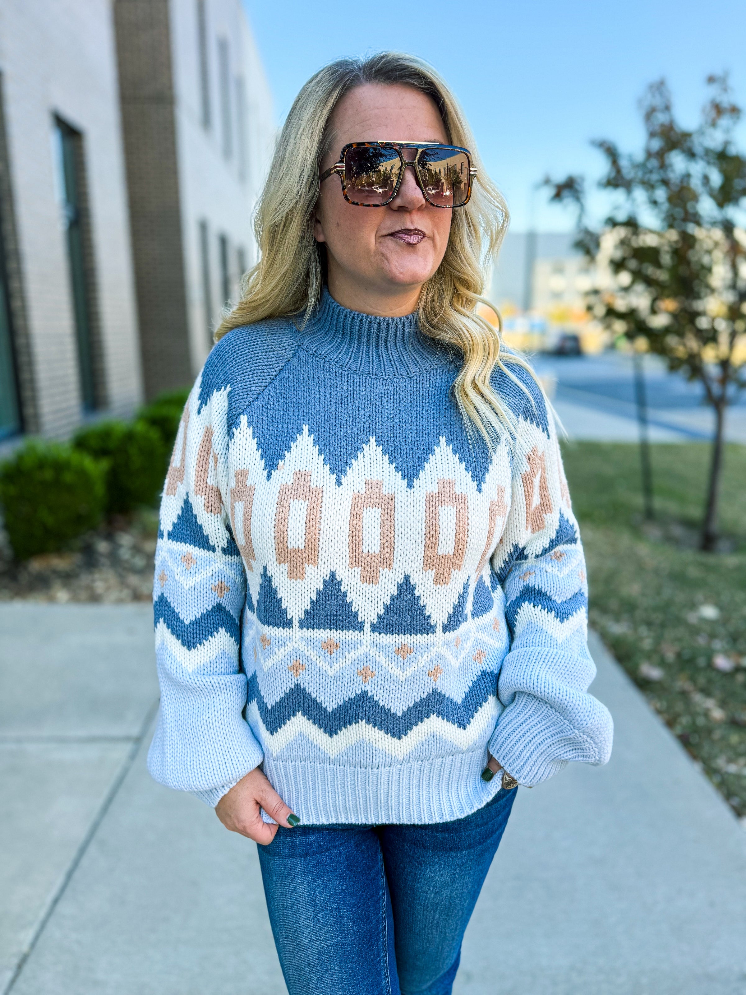 Stay warm and stylish all season long in this gorgeous Blue Chunky Knit Sweater, designed with a classic Fair Isle-inspired pattern in soft, wintery tones. Featuring shades of denim blue, cream, and warm beige, this sweater brings cozy alpine charm to your everyday wardrobe.