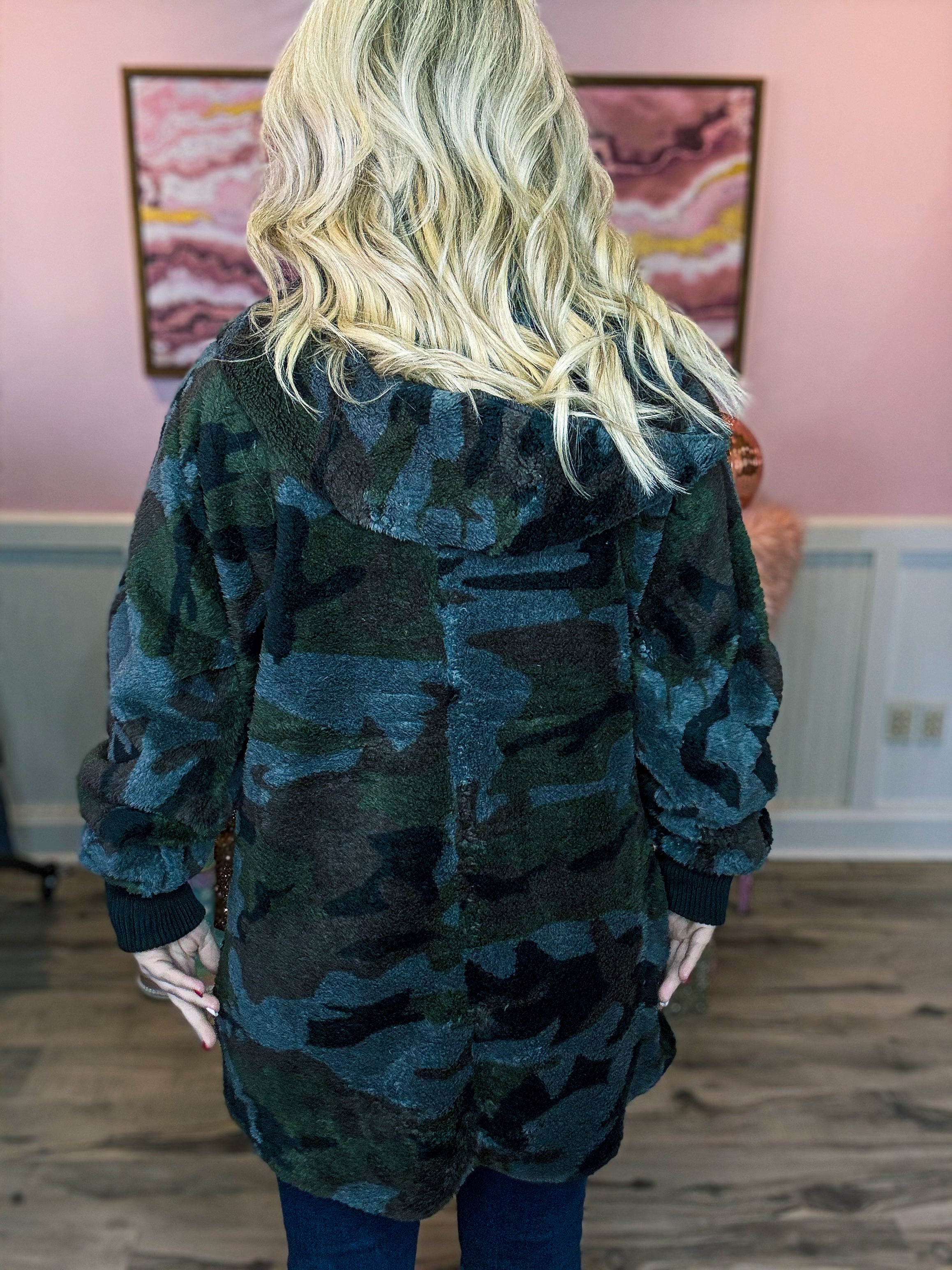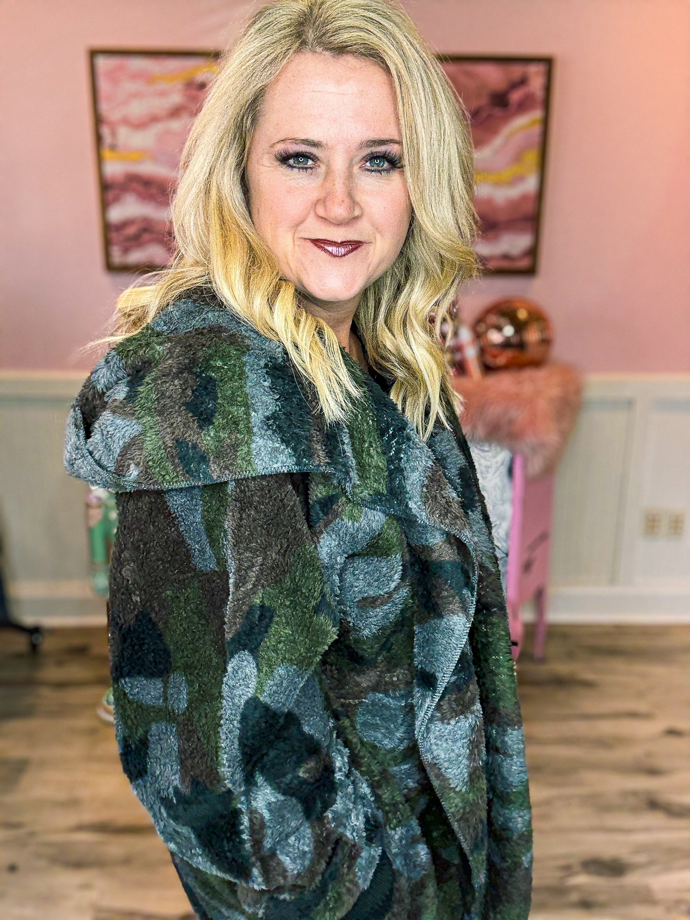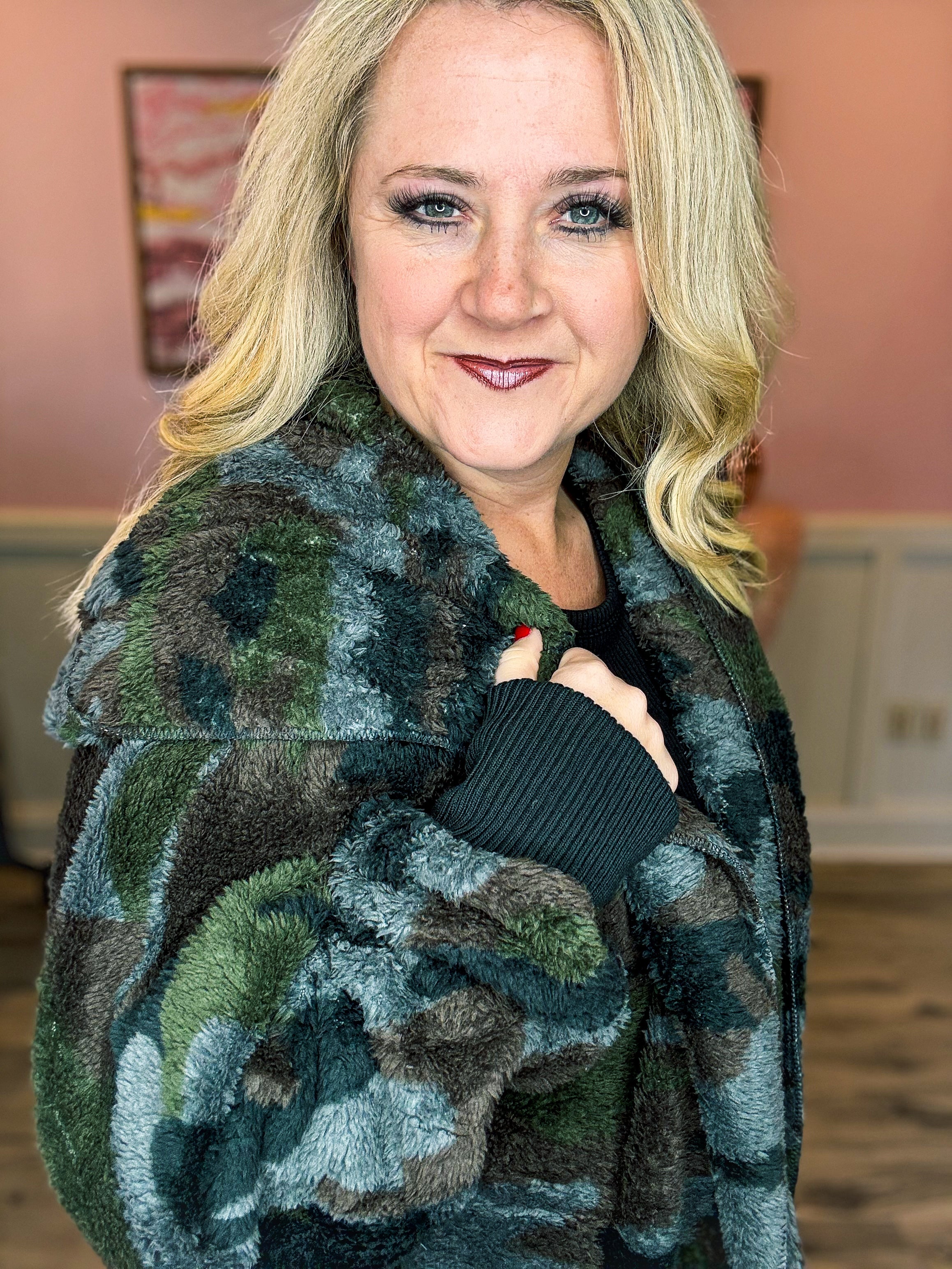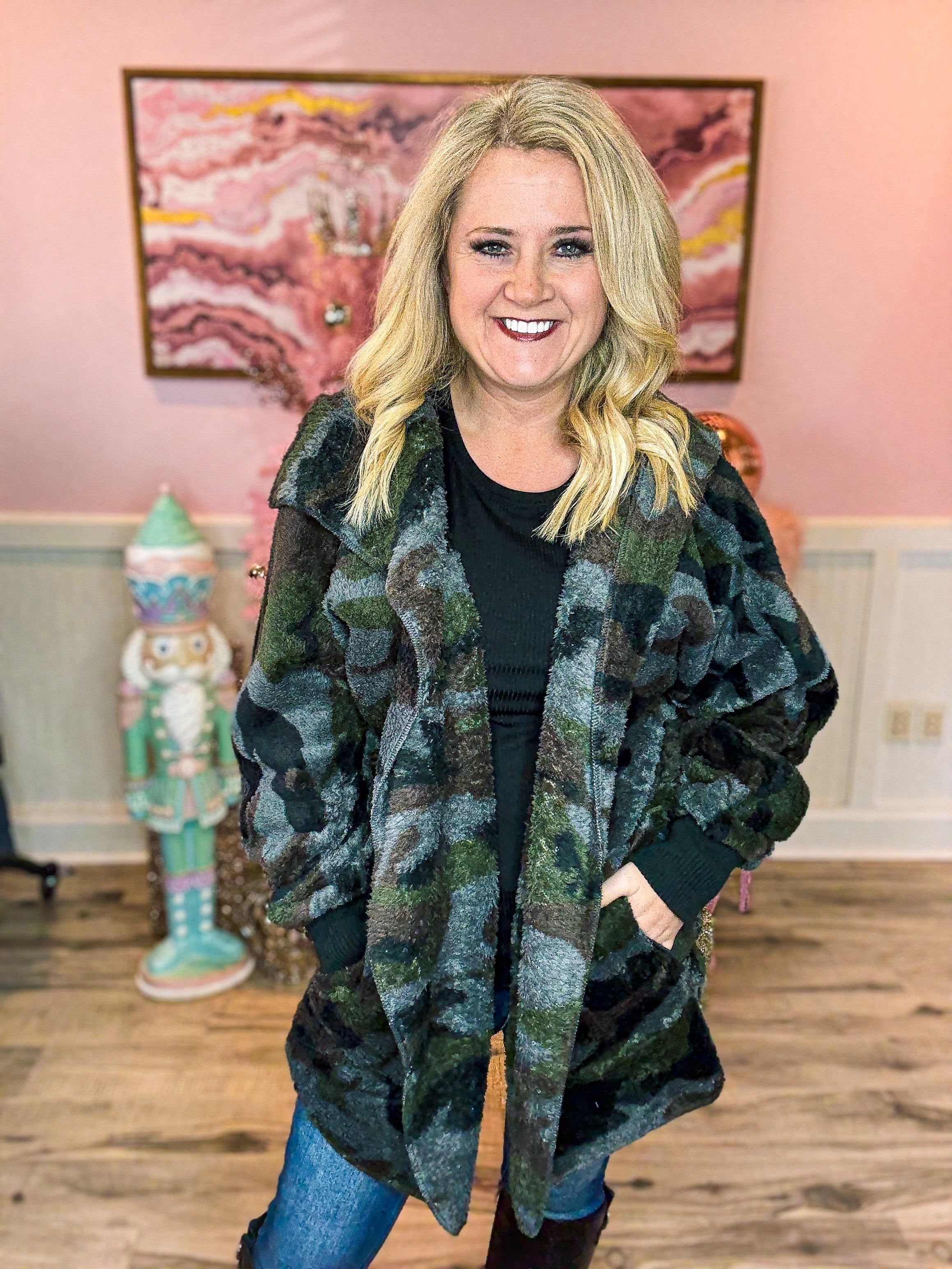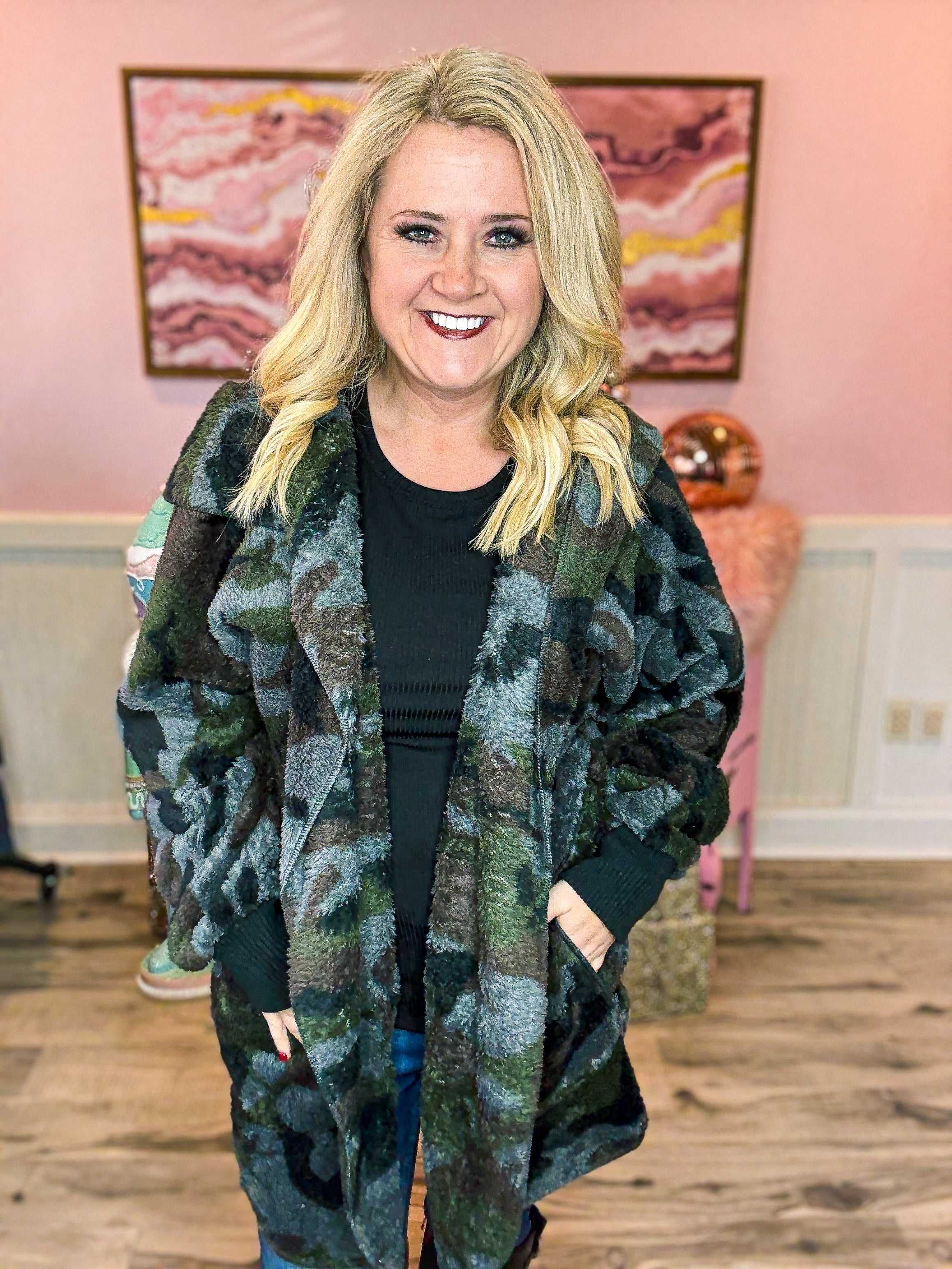 Stay warm, stylish, and effortlessly cool in this Camo Sherpa Jacket—your new go-to layering piece for chilly days. Designed with a cozy sherpa texture throughout, this jacket features a trendy camouflage pattern that blends rugged edge with everyday comfort. The open-front silhouette and relaxed fit make it easy to throw on over your favorite tees, sweaters, or hoodies.