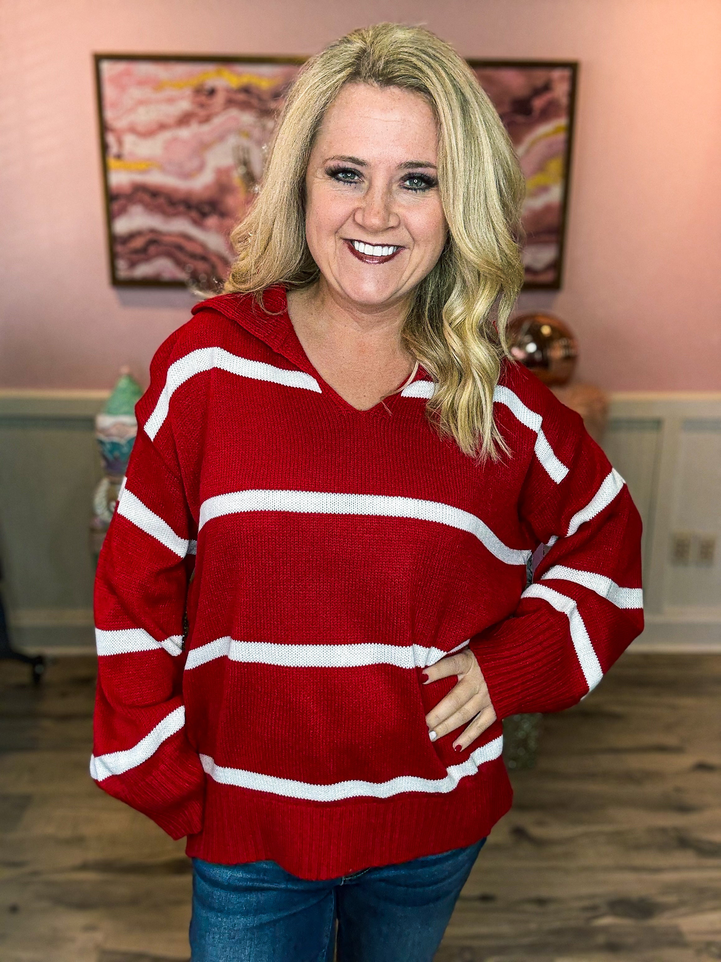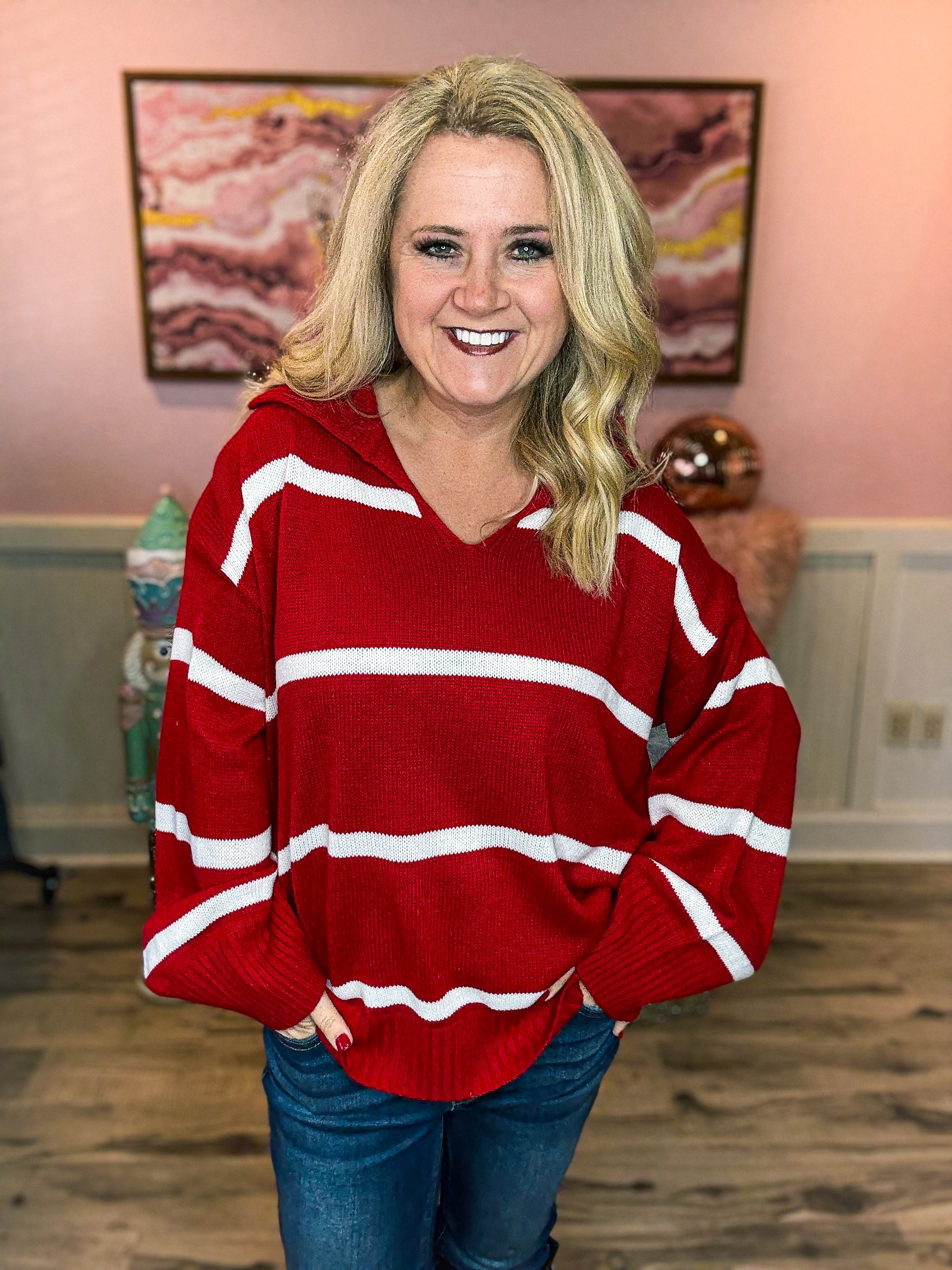Stay cozy and effortlessly stylish with this Haptics Red & White Striped Sweater. Featuring a classic red base with crisp white stripes, this sweater offers a timeless look with a modern, relaxed fit. Designed with a soft knit feel, a flattering V-neckline, and slightly ballooned sleeves, it’s perfect for everyday wear—from casual outings to seasonal gatherings.