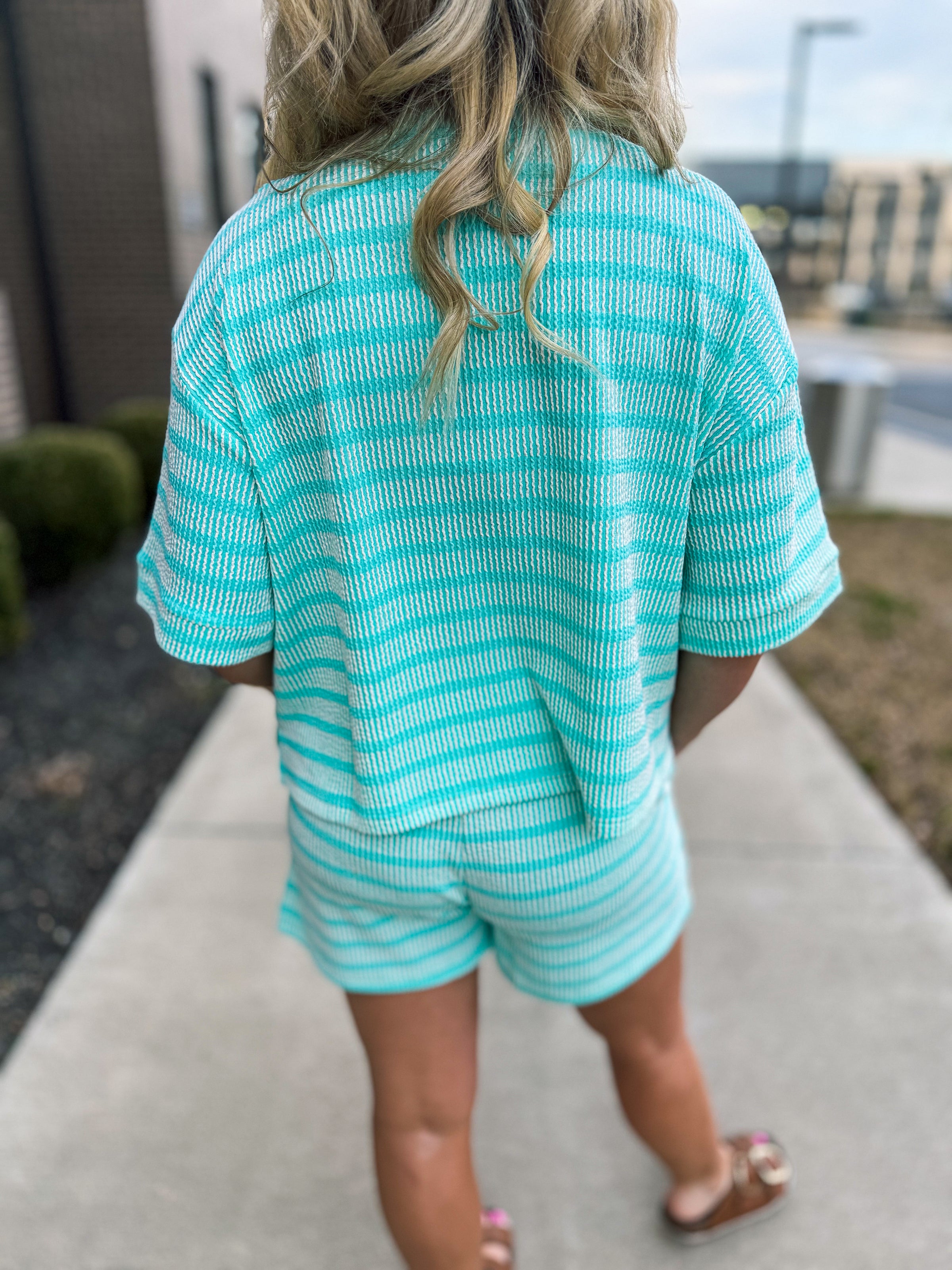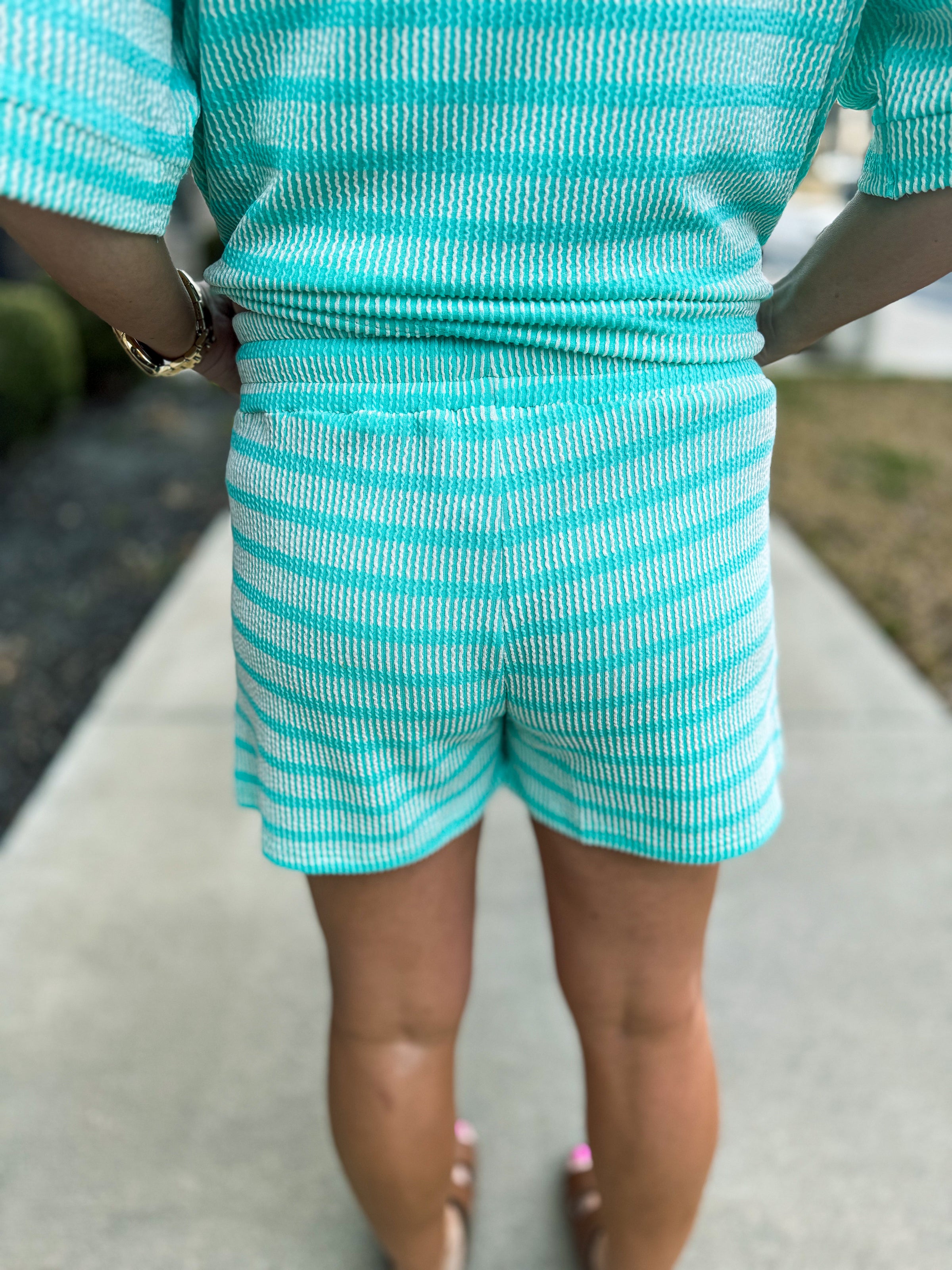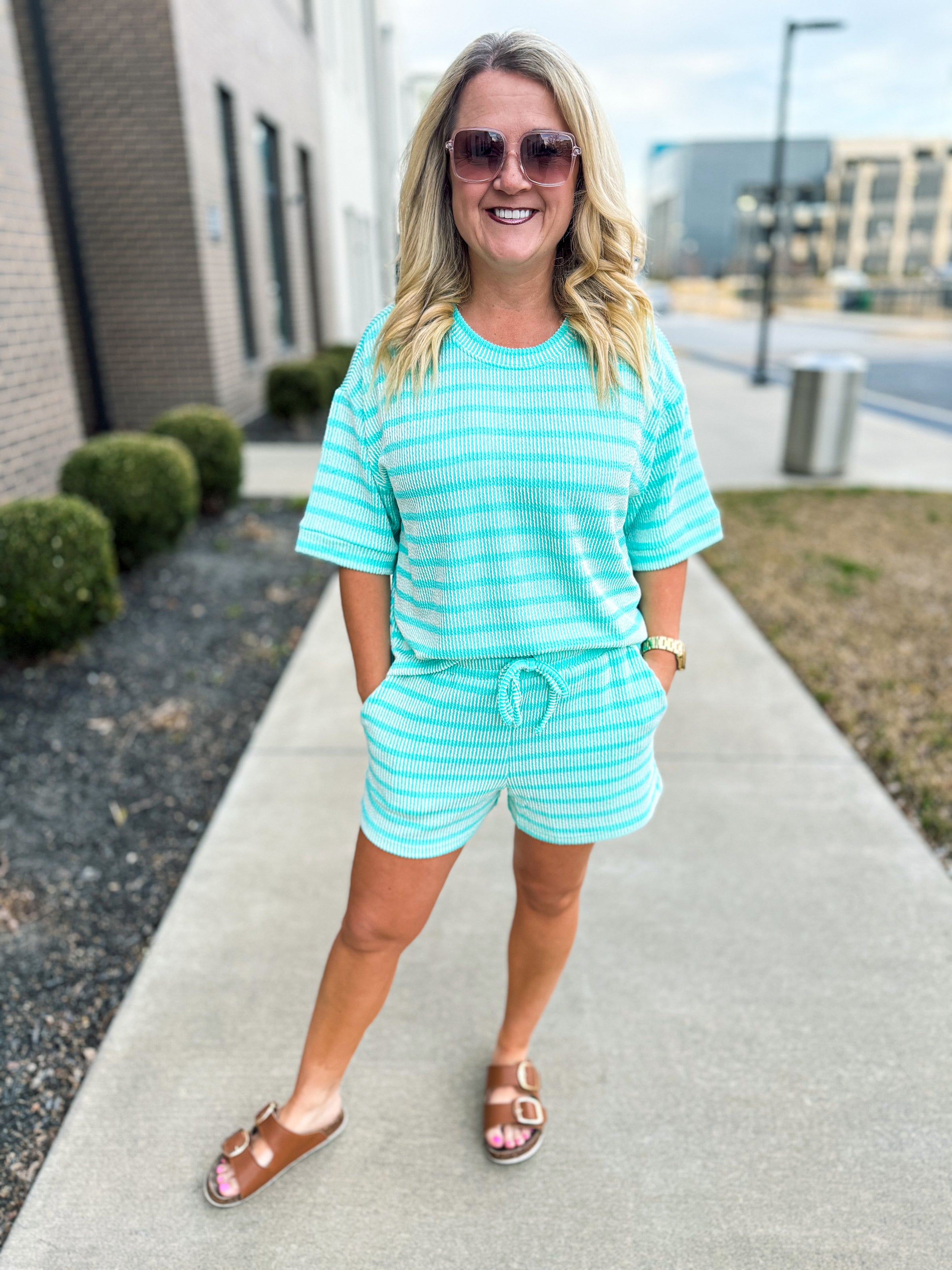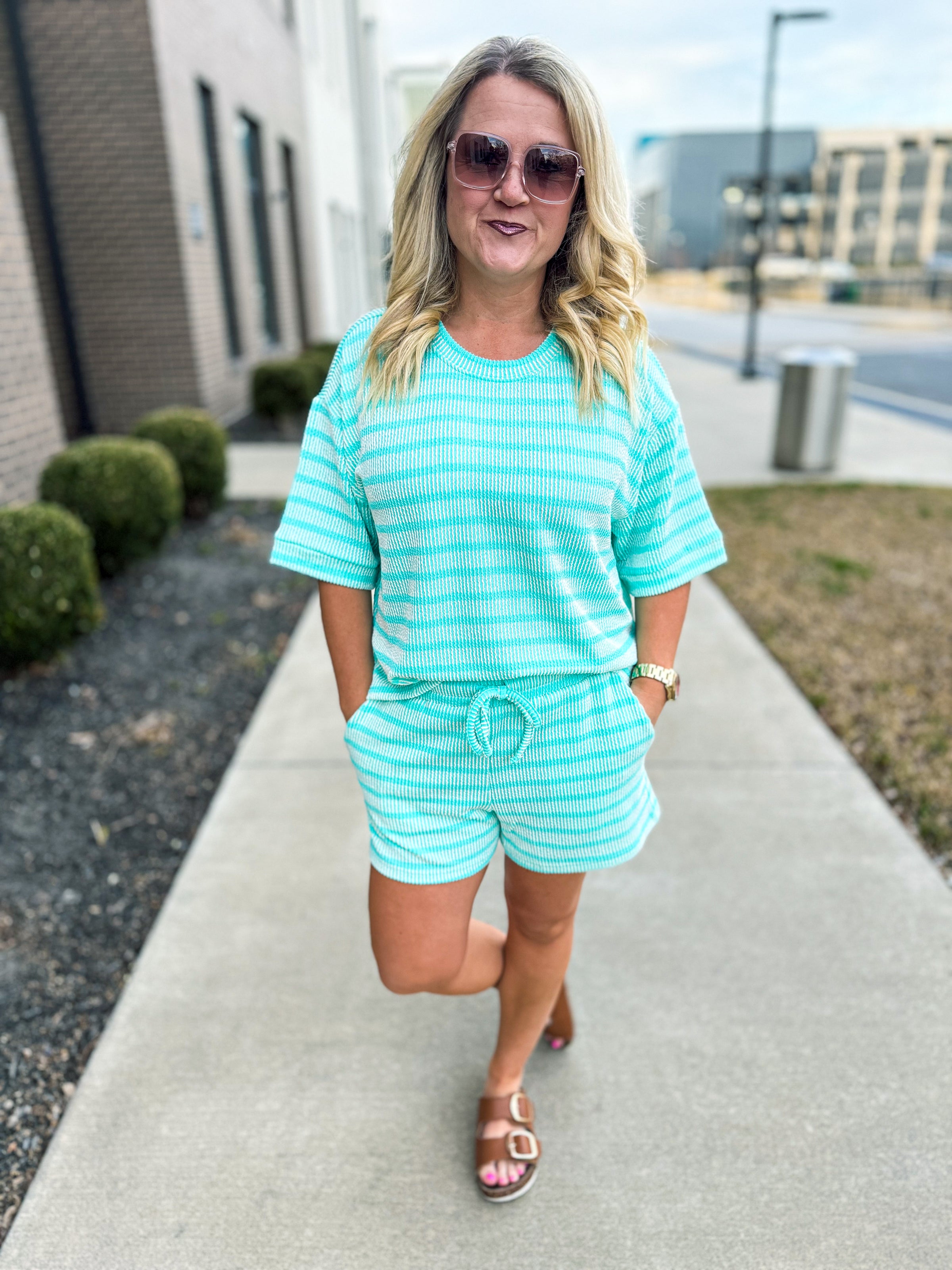 - Features a ribbed striped shorts set, side slit, relaxed fit, side pockets on shorts.