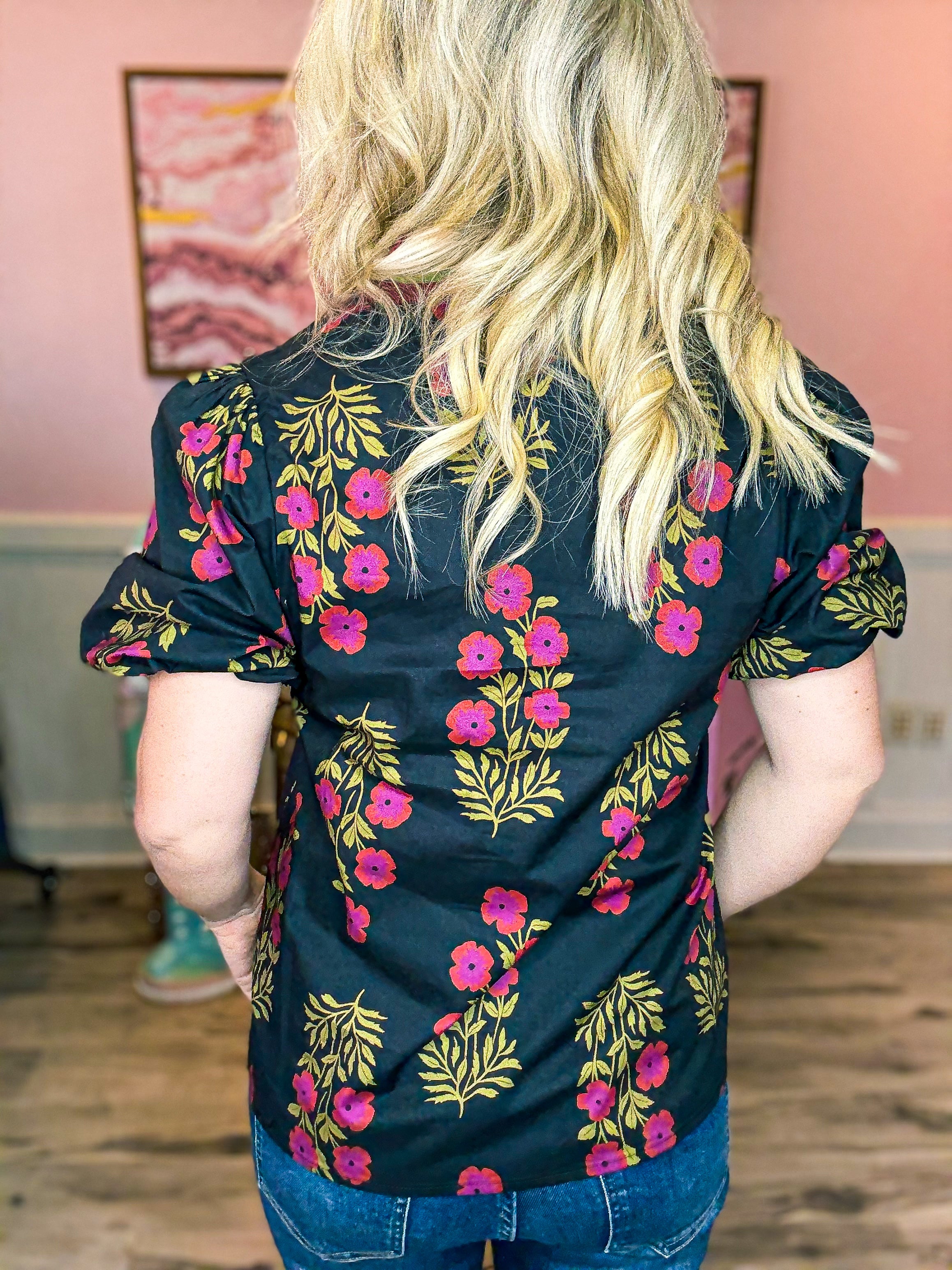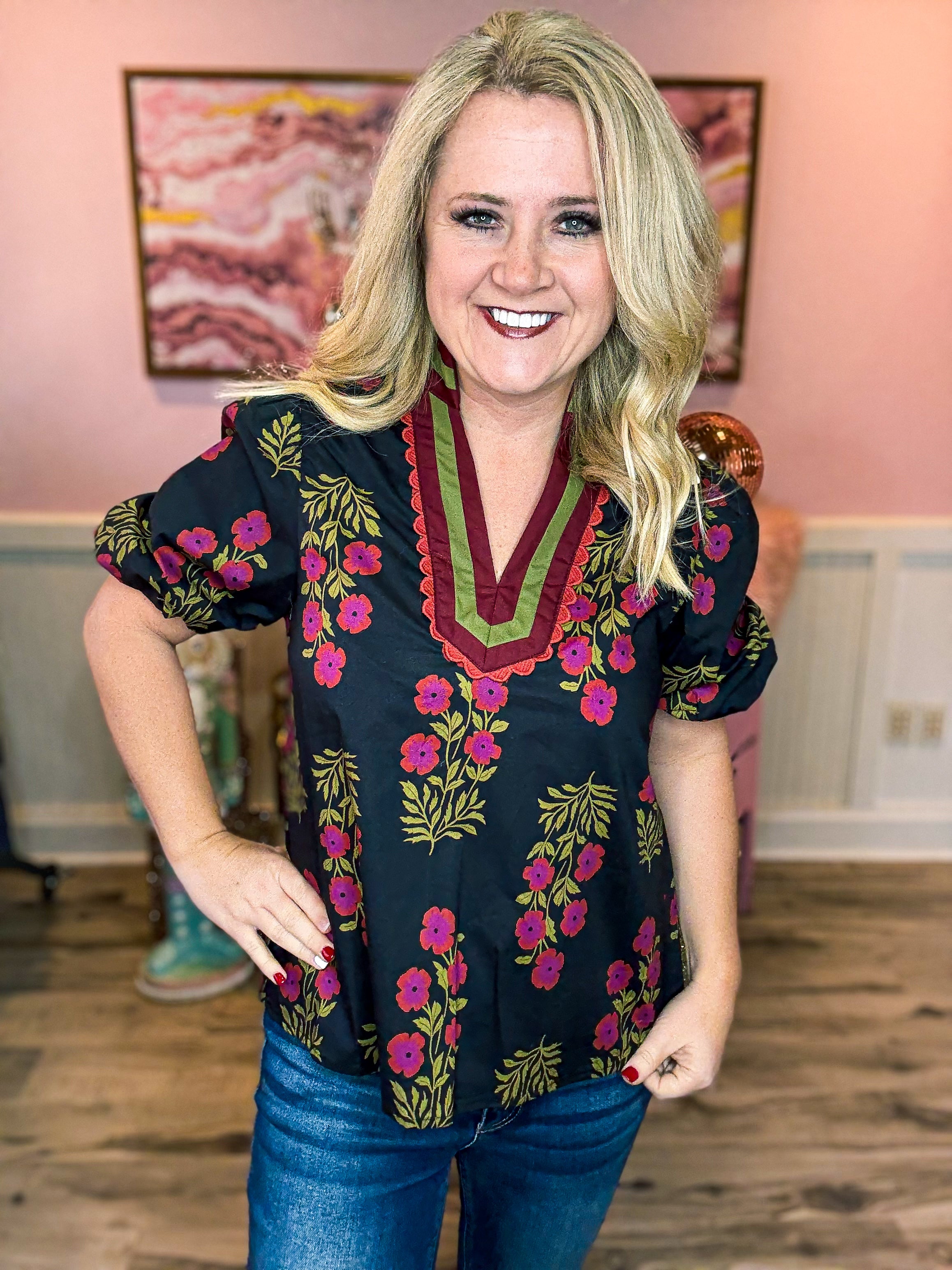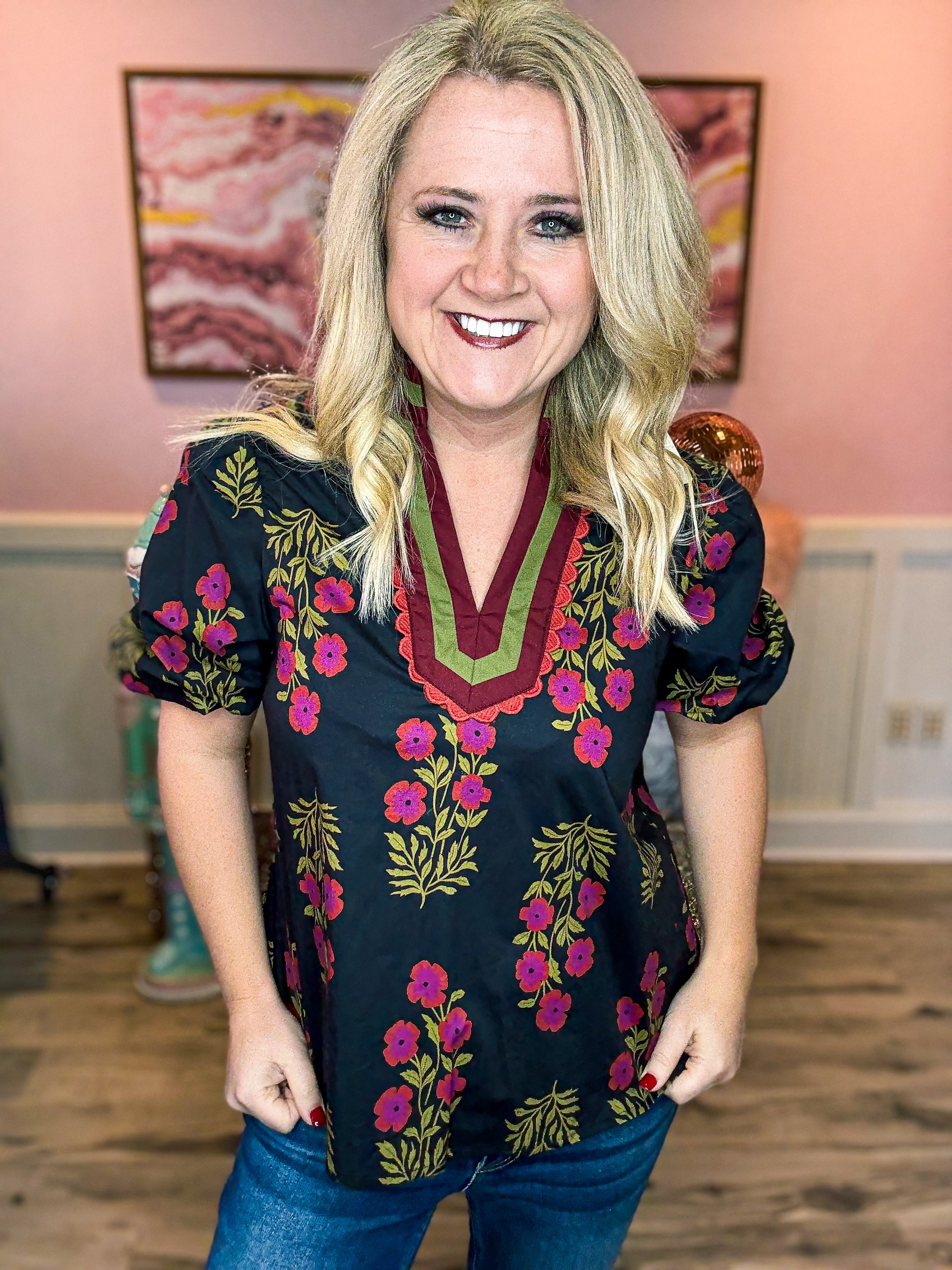 Elevate your everyday style with this Black Floral Entro Top—an effortlessly chic piece with beautiful feminine detail. Featuring a rich black base adorned with vibrant floral design, this top blends timeless elegance with a touch of bohemian charm. The contrasting embroidered V-neckline adds a standout detail, while the soft, lightweight fabric keeps it comfortable and easy to wear.