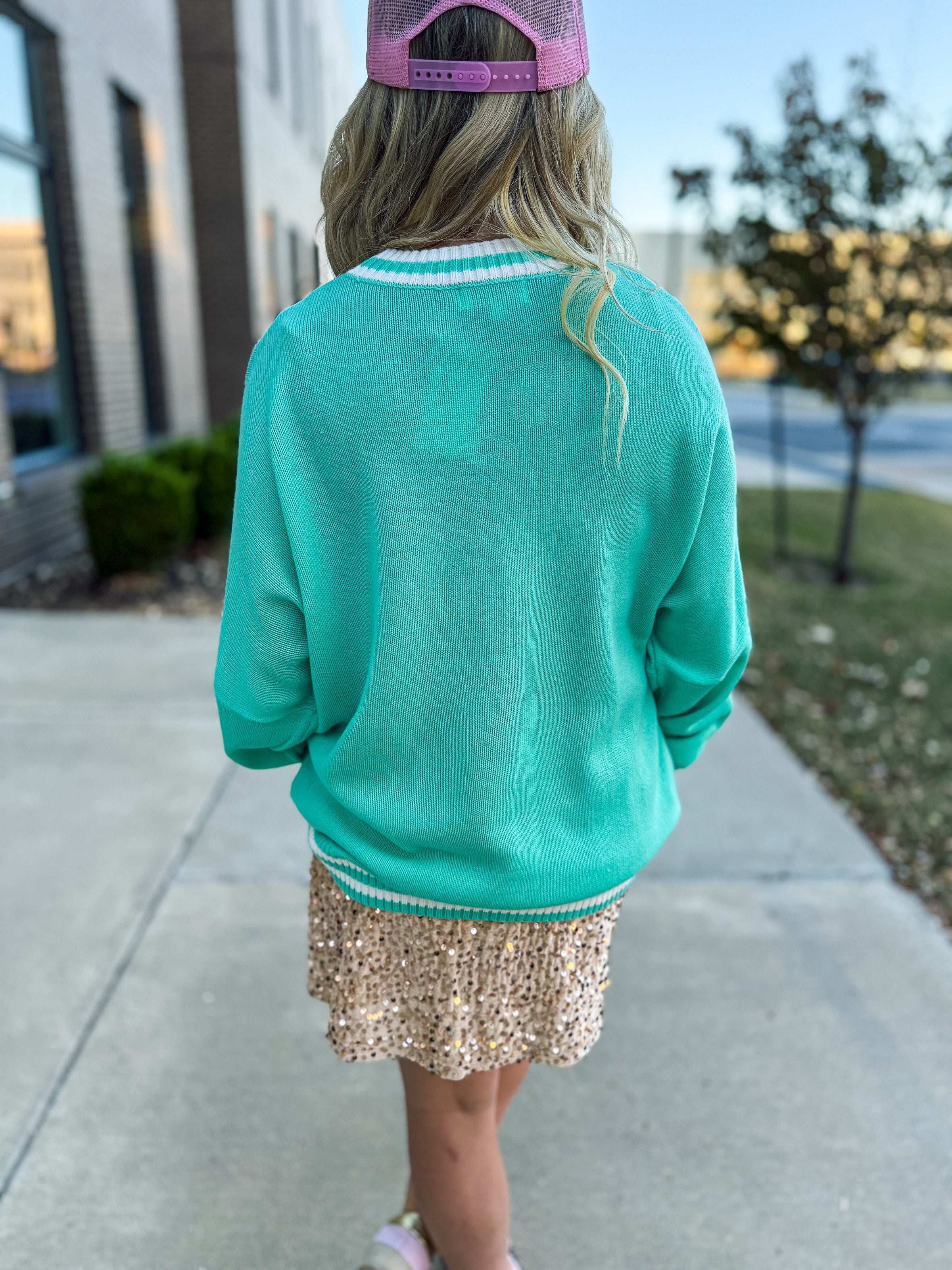 The cardigan features bold white-and-teal striped trim along the neckline, cuffs, and hem for a polished, sporty finish. Hot pink buttons add an extra fun touch, tying the whole look together with a whimsical pop of color. With its relaxed, cozy fit, this cardigan layers effortlessly over everything from jeans to sequin skorts (as shown!), making it a go-to piece for holiday parties, shopping trips, or cozy nights at home.