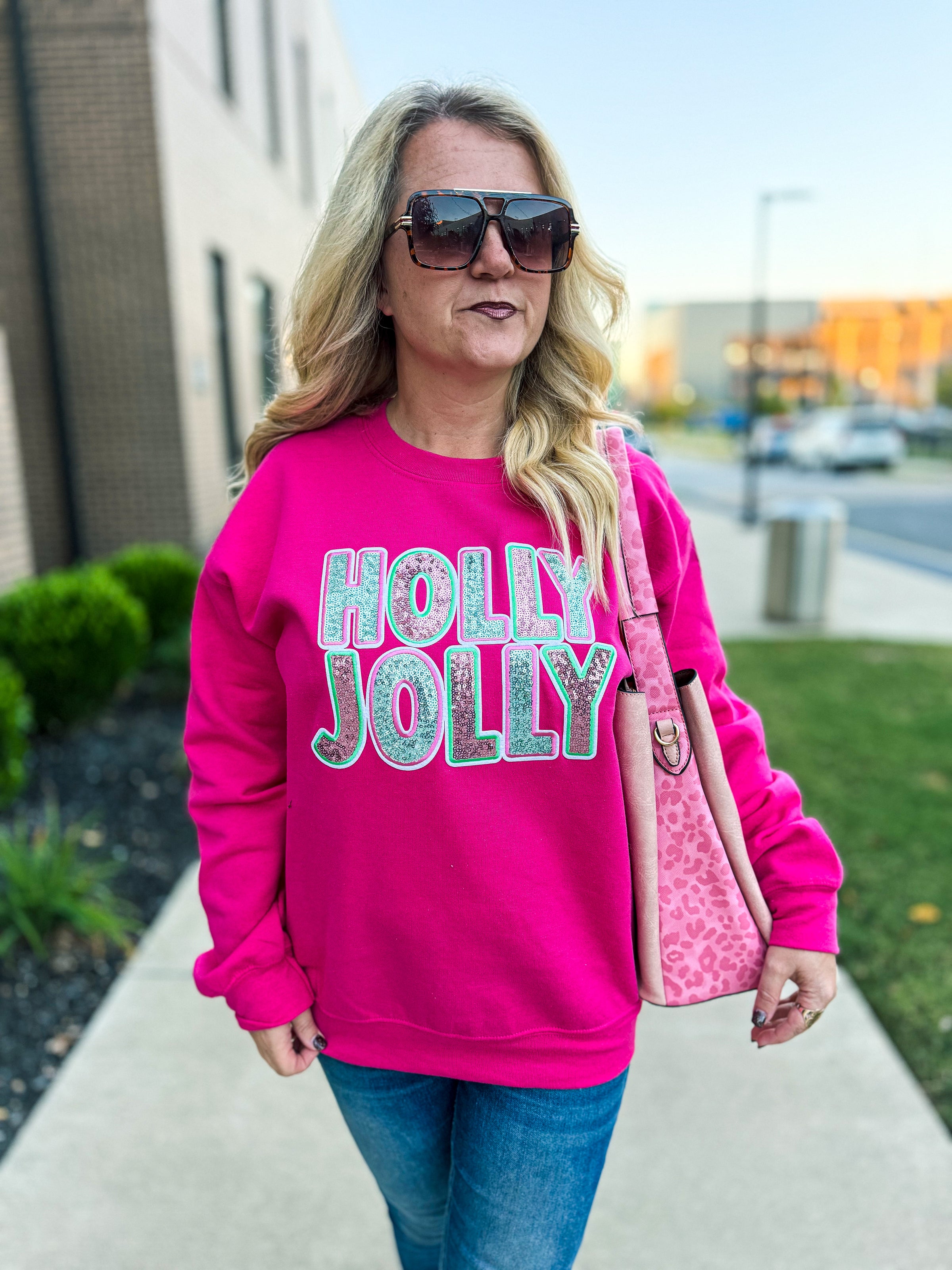 • Hot pink sweatshirt with glitter “HOLLY JOLLY” graphic