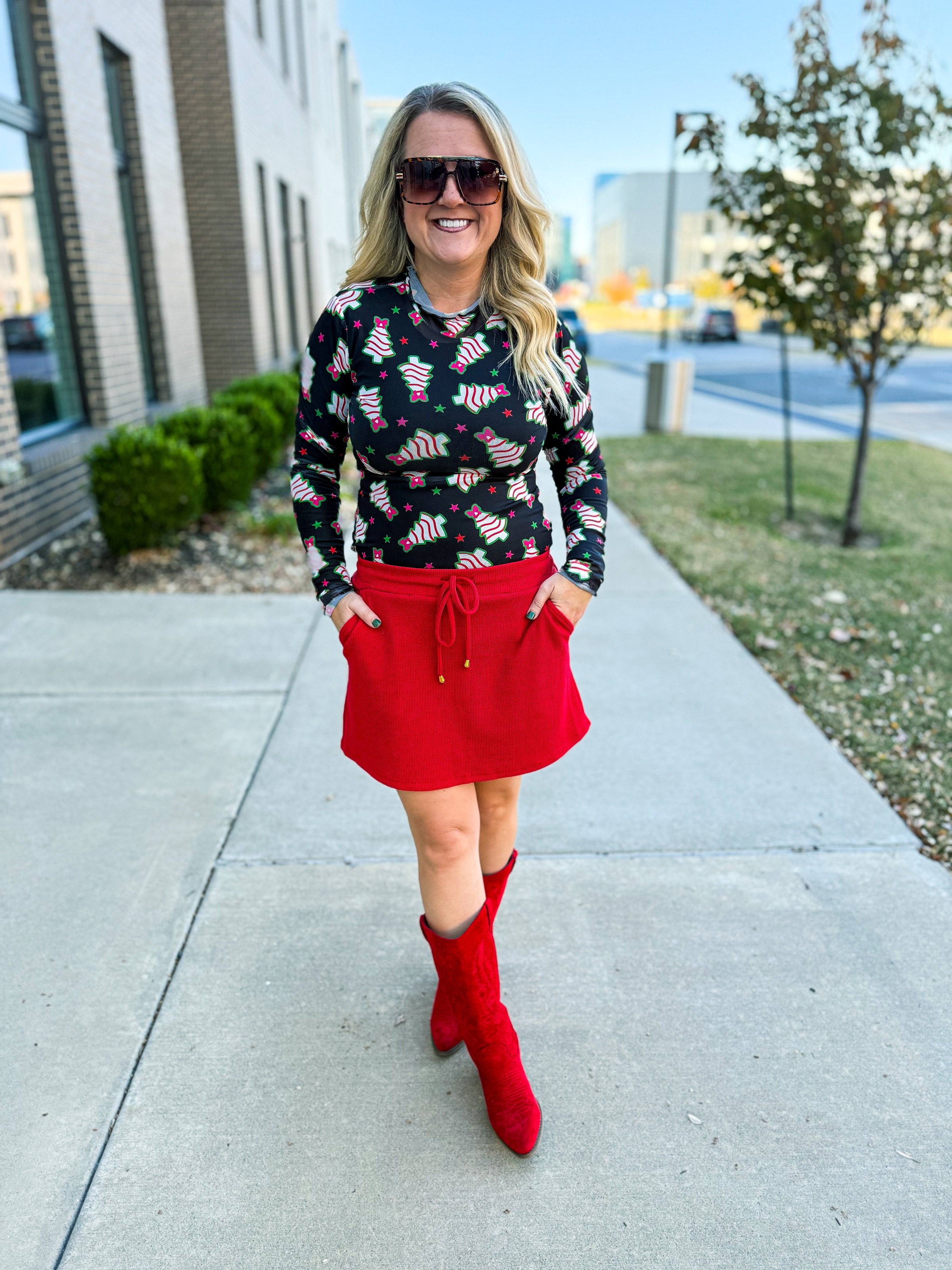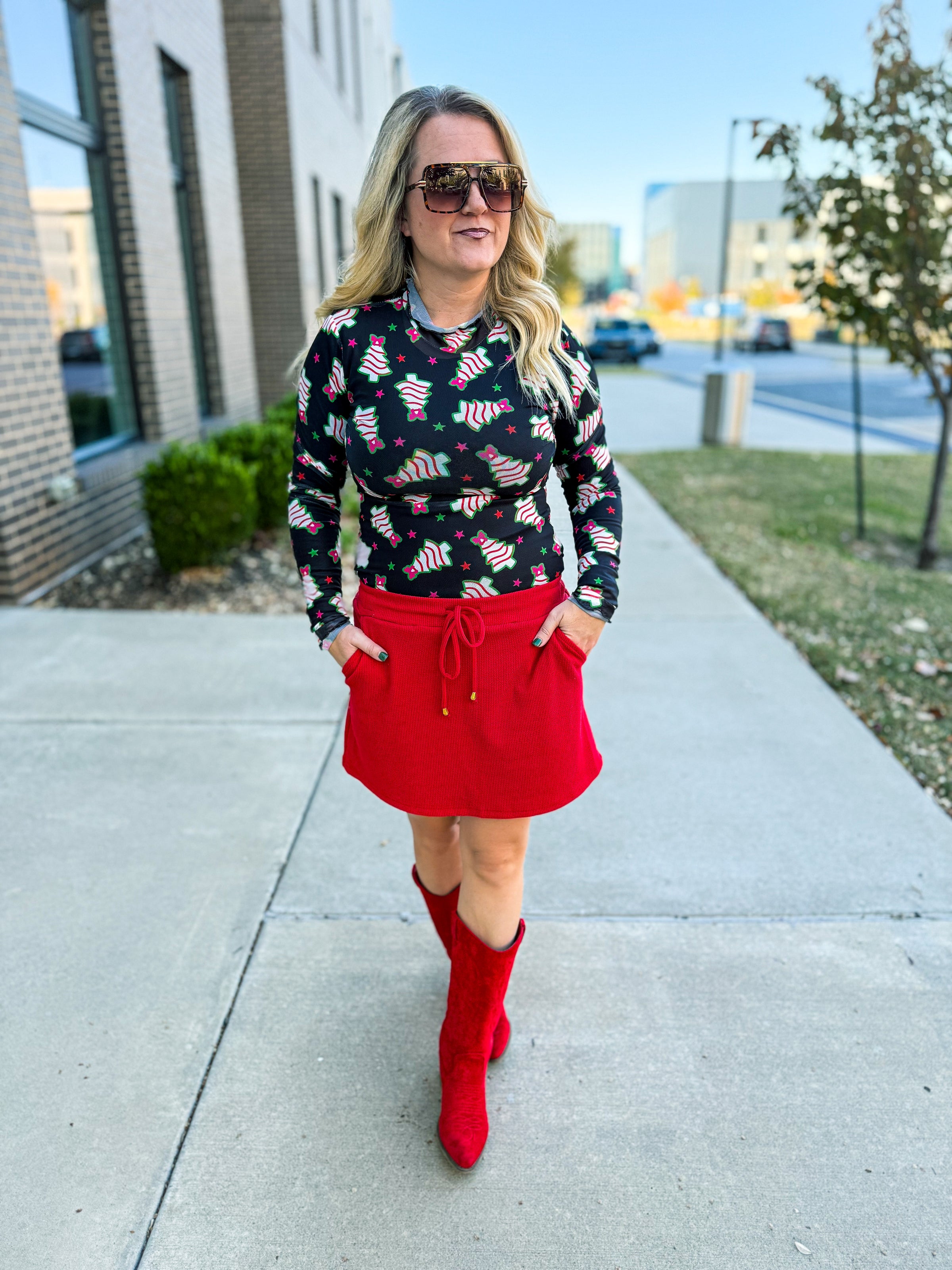 Designed with a lightweight, stretchy fit, this top layers beautifully under vests, blazers, or sparkly tops — or wear it on its own for a bold, trend-forward look. It’s comfy, chic, and guaranteed to turn heads at every holiday event!