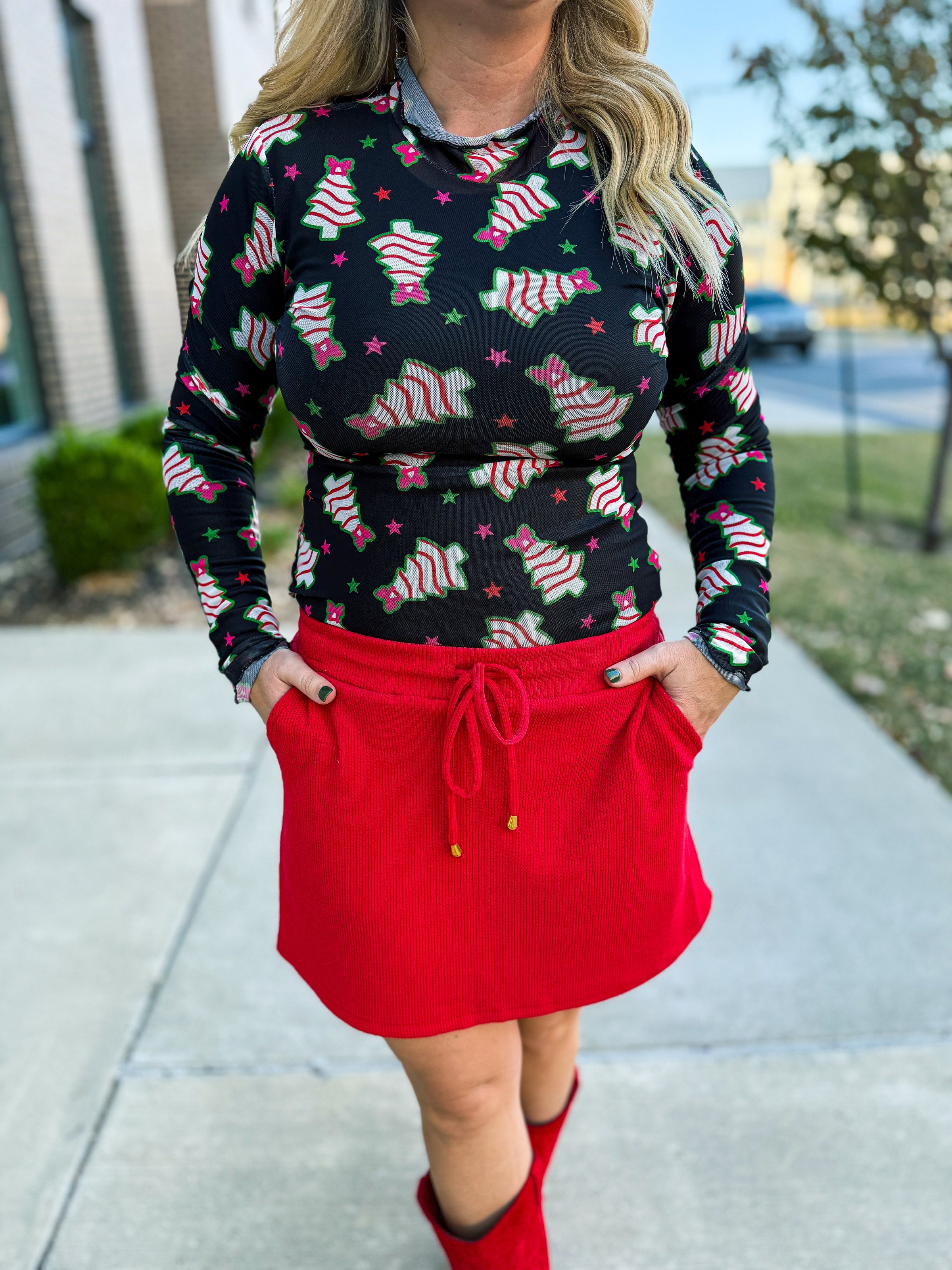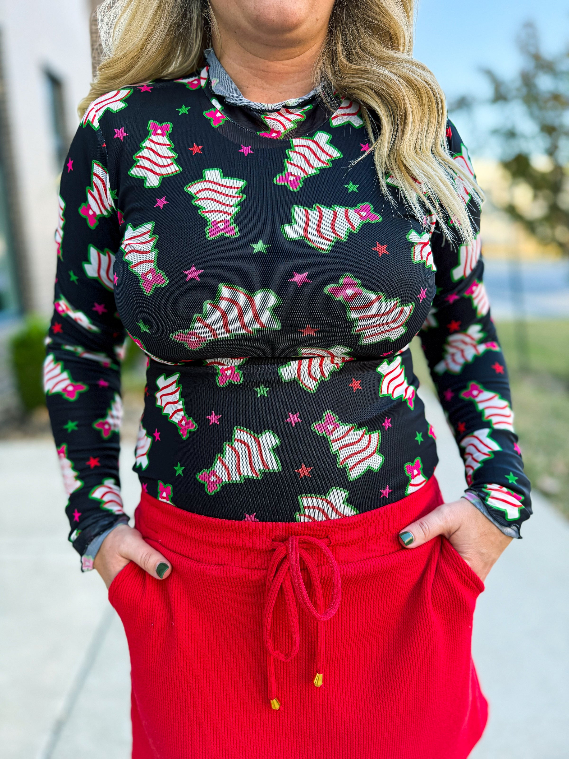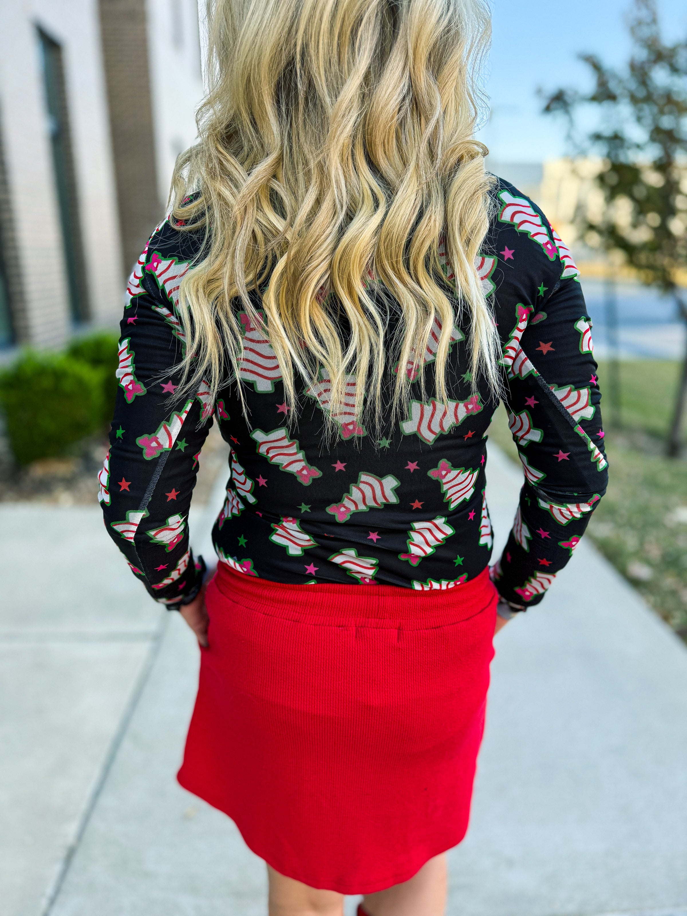 Make your holiday style merry and bright with our Christmas Tree Mesh Top — a fun and festive statement piece that’s full of personality! This sheer black mesh long-sleeve top features an allover print of whimsical Christmas tree cakes, decked out with red bows, green trim, and playful pink stars for that perfect touch of holiday cheer.